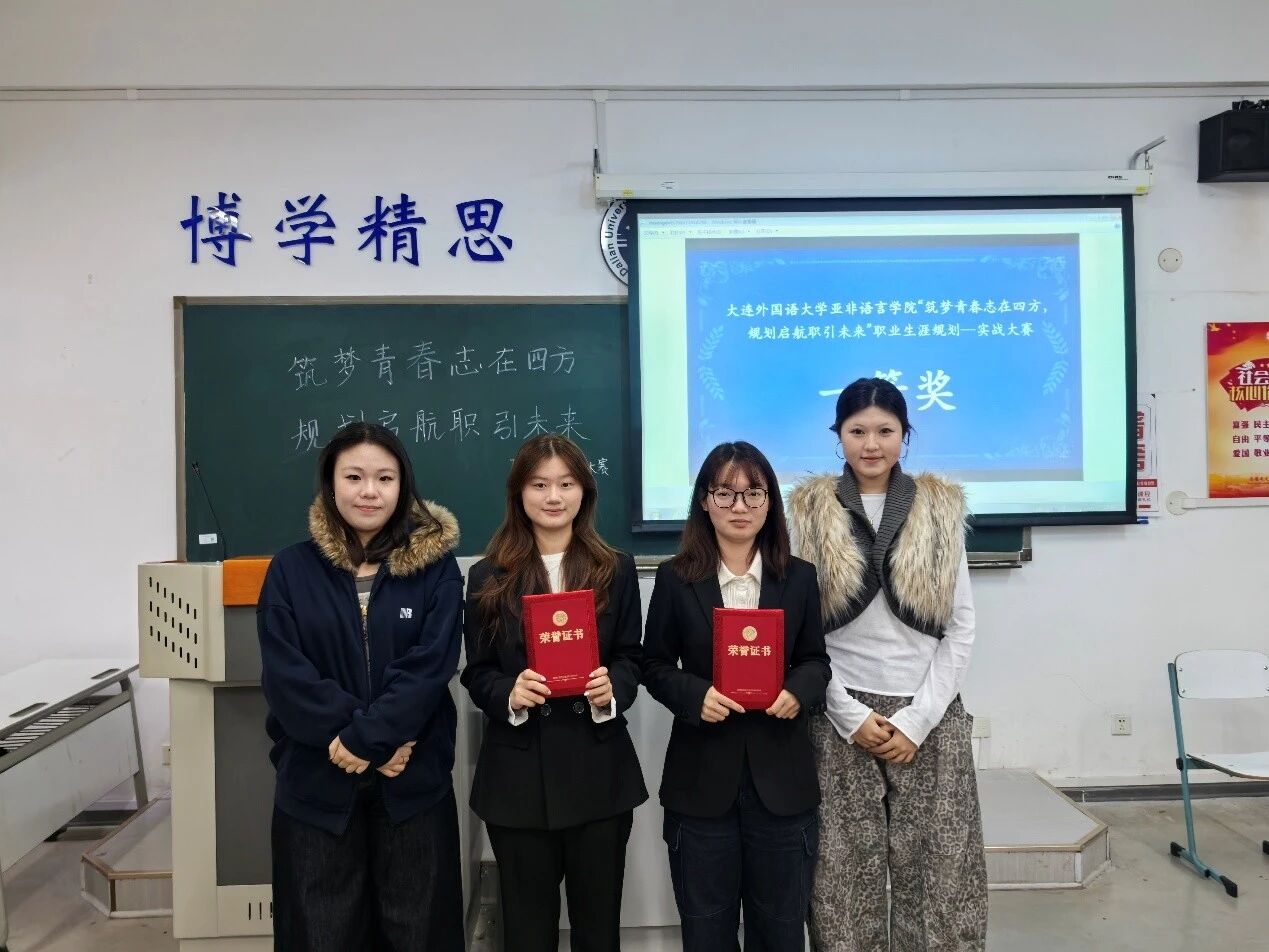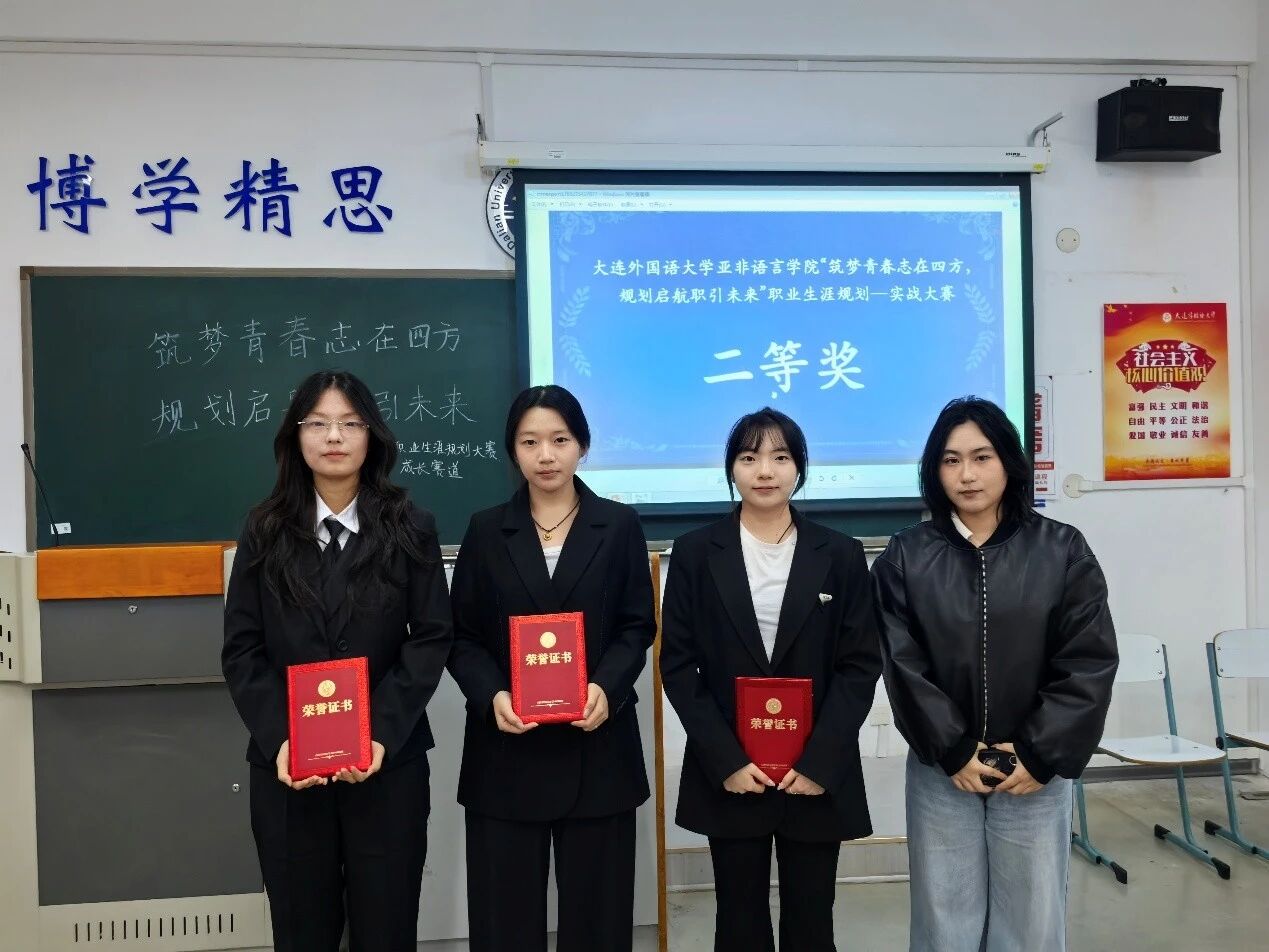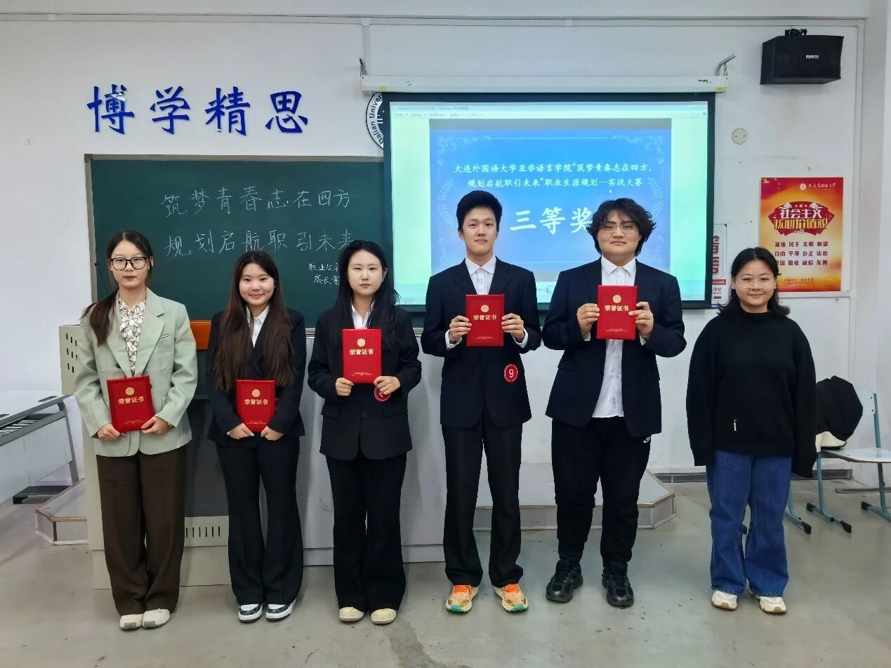 2025年11月16日下午,亚非语言学院于励学楼(7教)举行“筑梦青春志在四方,规划启航‘职’引未来”职业生涯规划实战大赛。本次大赛旨在增强大学生职业生涯规划的意识,提升个人综合素质,发掘个人潜能,增强竞争力,以适应社会发展的需求。本次比赛2023级、2024级、2025级共10名同学参加成长赛道。成长赛道评委由2201班周纾宇、2202班宫嘉忆、王彩、2203班李畅担任,2502班张丽娇、2505班景汇博担任主持人。本次比赛共分为选手个人展示和“4v1”面试两个环节。