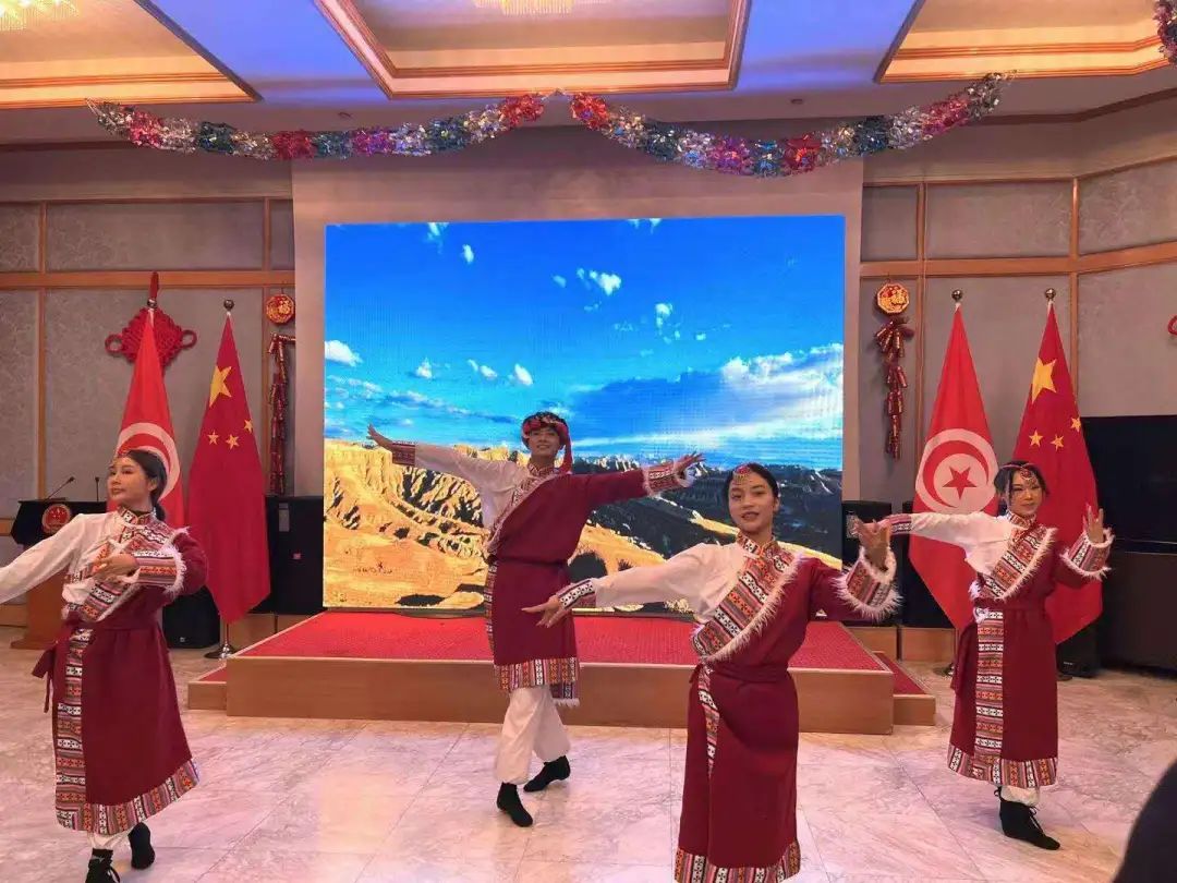 招待会现场氛围热烈而喜庆。访突的“你好!中国”成都文旅推介团现场表演了藏族舞蹈、二胡演奏、变脸等节目,带来精彩的文化盛宴。