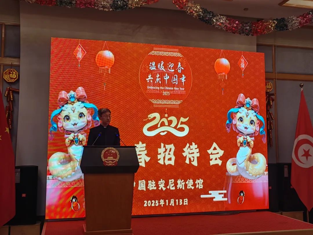 2025年1月13日,中国驻突尼斯使馆举办“温暖迎春·共庆中国年”新春招待会。万黎大使出席并致辞,驻突中资机构、援突医疗队、孔子学院、旅突华人华侨和留学生代表等约150人参加活动。