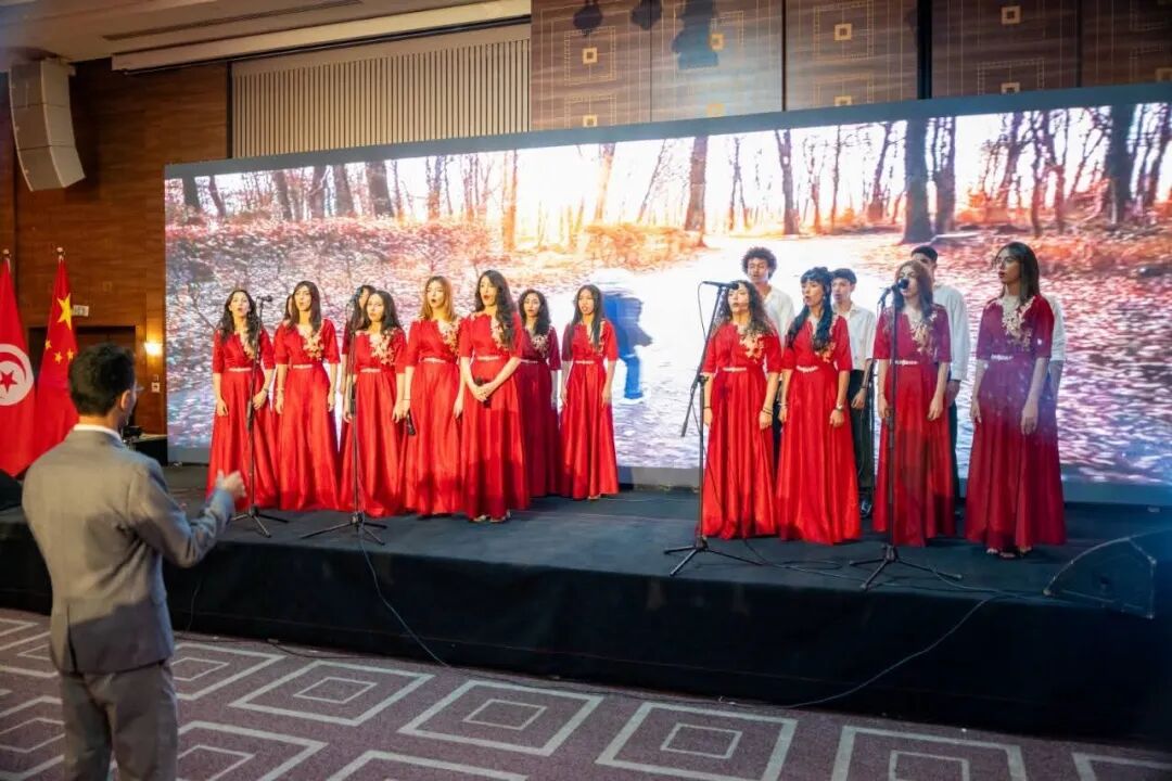 孔子学院合唱团带来了精彩演出。他们先后演唱了中突两国经典曲目《如愿》和《一首献给你的歌》(Ghenya Lik),动人的旋律跨越语言,传达出中突人民之间的深厚情意,串联起中突两国人民的情感共鸣,赢得了现场阵阵掌声。在悠扬的音乐中,来宾们品尝美食,畅叙友情,盛赞中国发展成就,祝愿中突两国人民幸福安康,友谊地久天长。