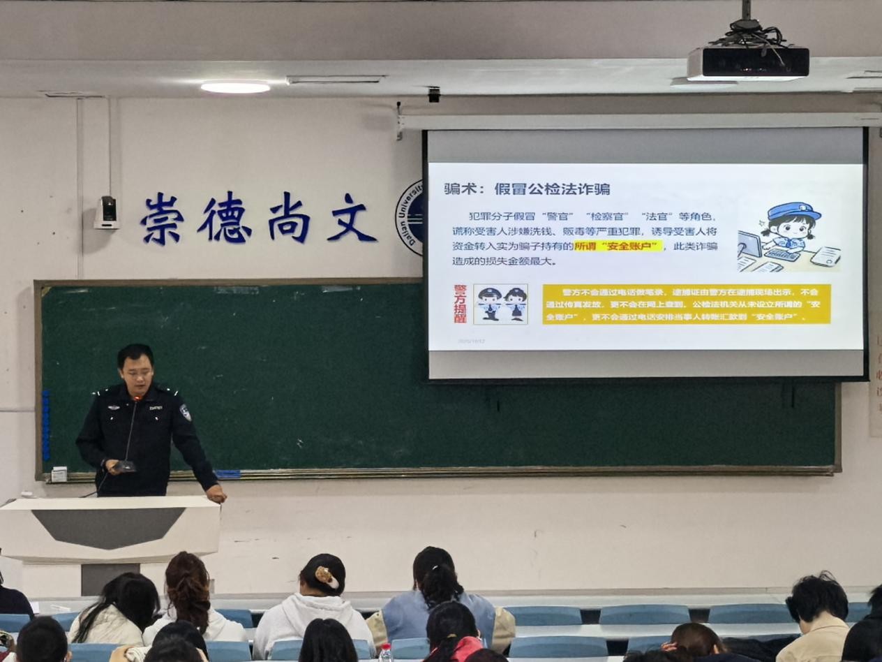在本次讲座中,张晓盟警官生动揭示了当前针对大学生群体的多种典型诈骗套路,包括机票改签、兼职刷单、虚假购物及网络游戏类诈骗等。张警官特别提醒同学们,要筑牢心理防线,克服贪利侥幸心理,树立理性消费观和勤俭节约的价值观,避免因攀比虚荣而落入诈骗圈套。最后,他强烈呼吁,在面对任何索取个人信息或资金转账的要求时,务必提高警觉,不轻信、不点击、不转账,切实守护好自身财产安全与信息安全。