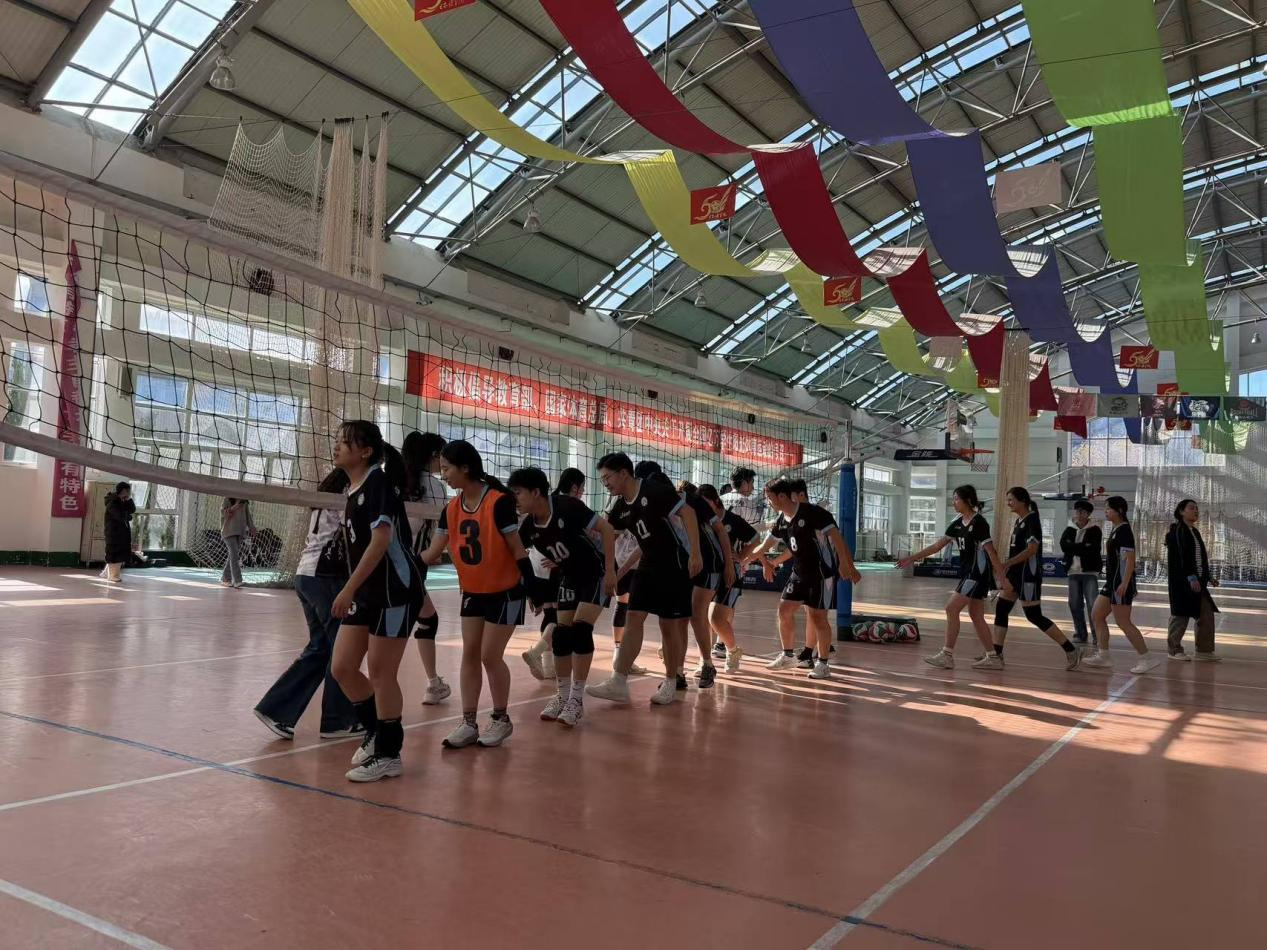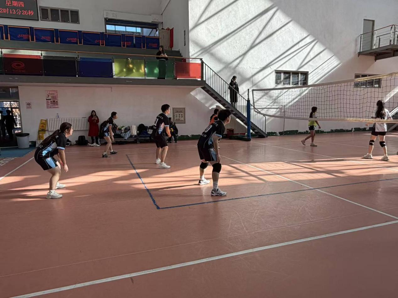 2025年11月13日中午,亚非语言学院排球队对战新闻与传播学院排球队。比赛开始前,亚非语言学院排球队的队员们提前来到场地,进行热身活动和战术布置。