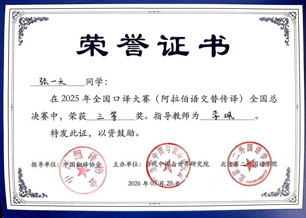 3月29日,2025年全国口译大赛在北京第二外国语学院举行。我院阿拉伯语专业2022级本科生张一天在阿拉伯语教研室李珮老师的指导下,经校赛、初赛、复赛的层层选拔,顺利晋级决赛,最终荣获阿拉伯语交替传译三等奖。