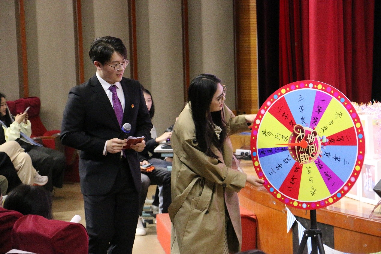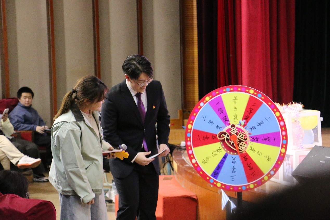 在精彩的节目间隙,晚会设置了趣味十足的“猜歌名”互动环节,热情邀请台下同学踊跃参与。成功猜出歌曲的同学即可通过转动转盘获得精美小礼品,让现场欢声笑语不断,气氛更加热烈活跃。