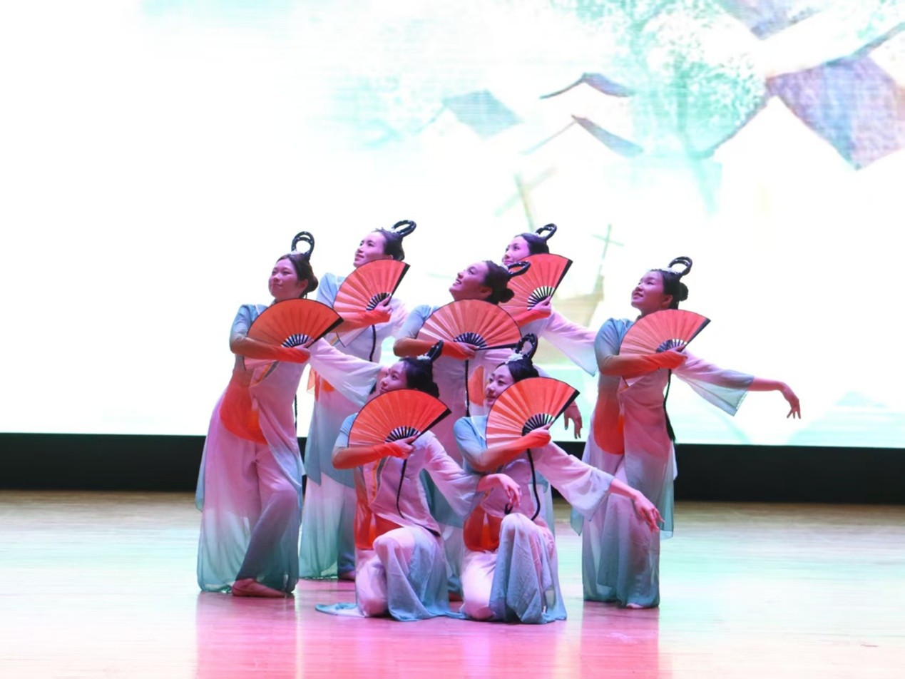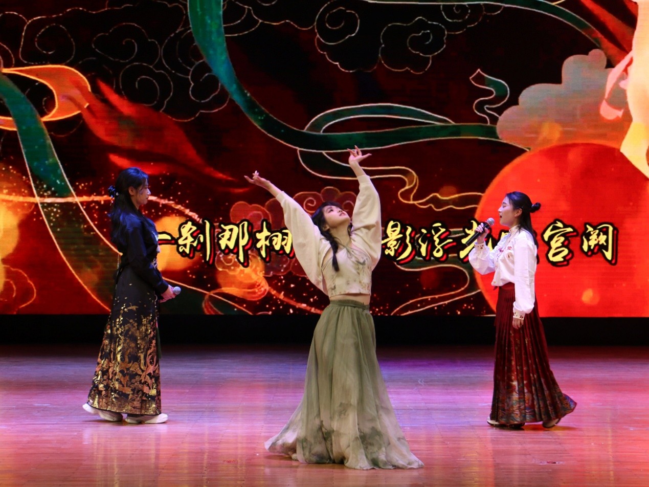 2503班阿拉塔、2505班王晓辰、魏萱儿带来歌伴舞《壁上观》,婉转唱腔搭配灵动舞姿,韵味十足,尽显国风雅致。